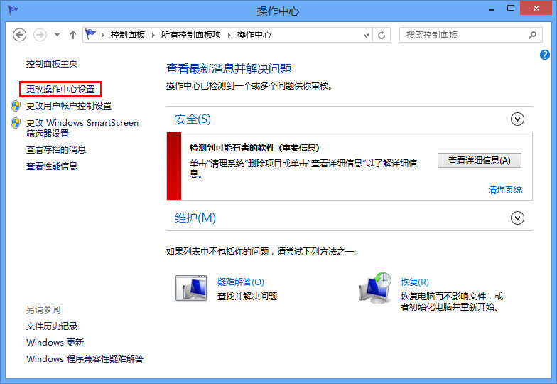 3、打開控制中心,點擊左側選項“更改操作中心設置”,然后下拉尋找“問題報告設置”項,如圖所示: