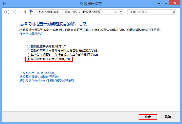 4、從問題報告設置窗口采用“從不檢查解決方案”選項,完成后直接按下“確定”按鈕進行保存,如圖所示: